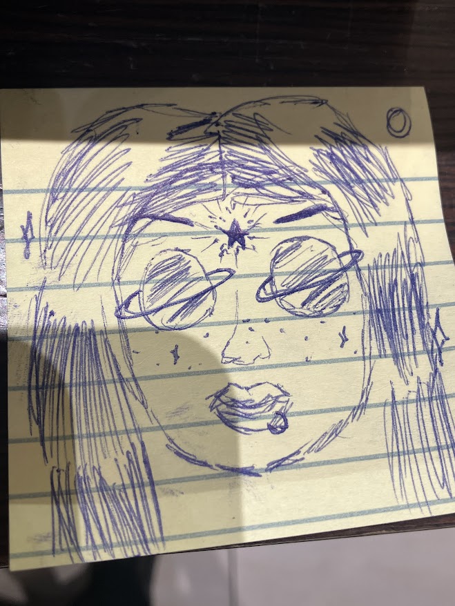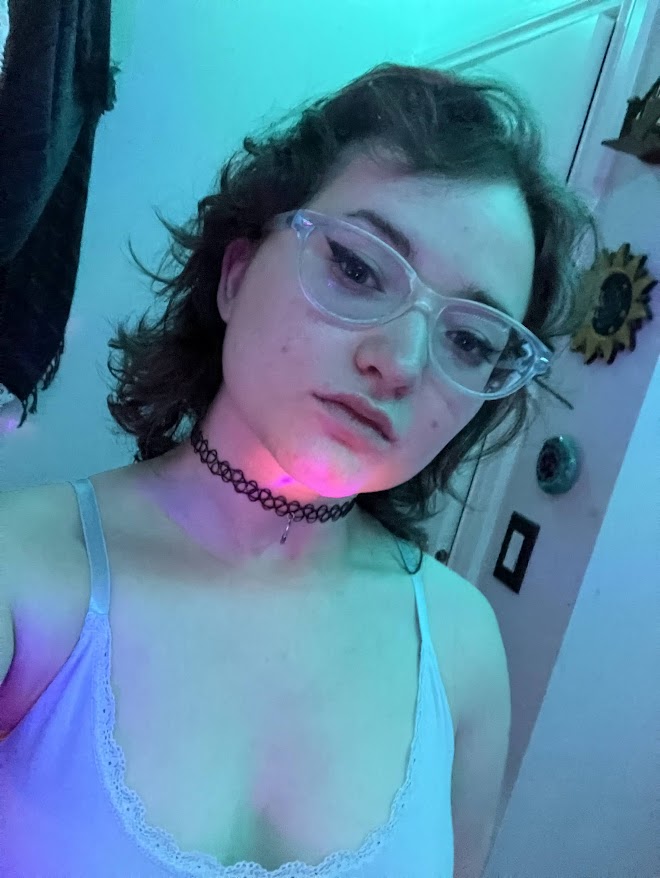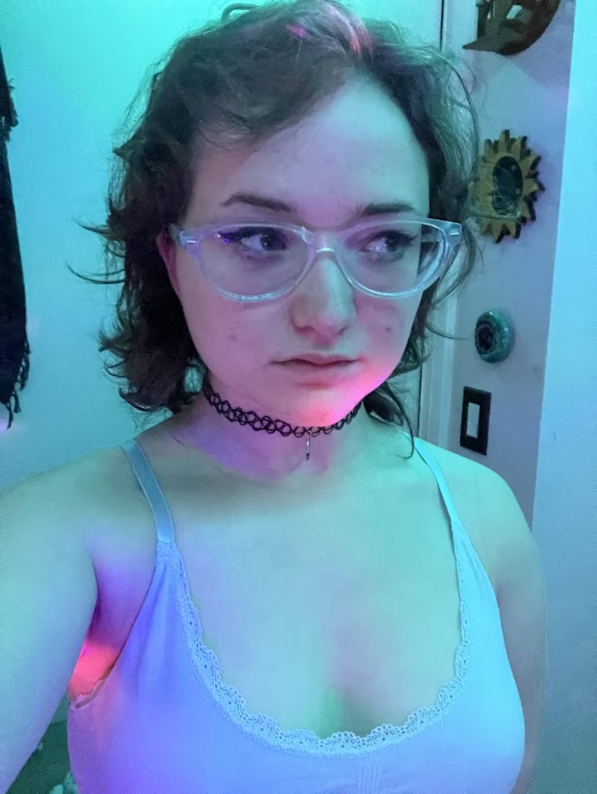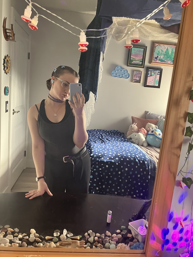 I wore my dark blue mom jeans with the white belt I stole from my grandmother's bag of things she was donating. It's started falling apart since when I stole it but I still use it. I wore my white tank top with the blue ditsy floral print, then I wore my oversized pink shawl over top. The shawl gave it that professional look while also covering up the temporary tattoo on my shoulder from the pride festival yesterday.